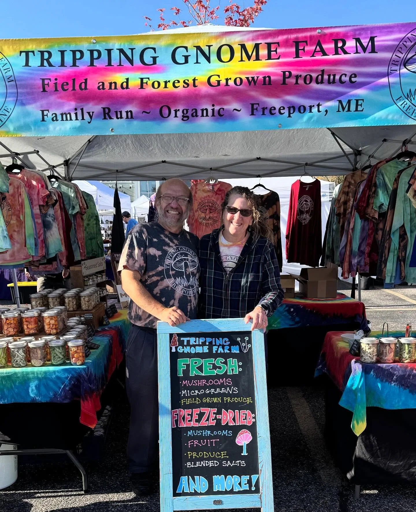 We are a family-run farm in Freeport, Maine specializing in mushrooms, microgreens and field and forest grown produce. Our mission is to ensure that no food goes to waste here at Tripping Gnome, so everything we grow is sold fresh or freeze dried, or donated to those in need in the greater Freeport area. We care deeply about responsible stewardship of the land we farm and are committed to caring for and connecting with our community. We invite you to come along for the ride!